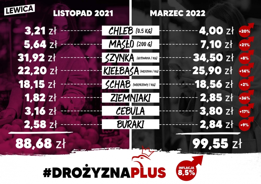 Polityk przypomniał, że dokładnie taki sam koszyk produktów Lewica zaprezentowała w listopadzie ubiegłego roku. Wówczas za podstawowe produkty, jak chleb, masło, szynka, kiełbasa, ziemniaki, cebula i buraki trzeba było zapłacić nieco ponad 88 złotych. Dziś jest to już prawie 100 złotych. Parlamentarzysta stwierdził, że tarcza antyinflacyjna po prostu nie działa, a obniżanie podatków jest nieskuteczne właśnie przez rosnące ceny, ponieważ to, co zostaje w kieszeniach w związku z obniżeniem podatków, ludzie muszą wydać na drożejące zakupy.